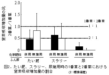 4) 以上の係数を用いて草地に対するふん尿の肥料換算を行い、年間の不足量を化学肥料で補填する。チモシー草地にたい肥、スラリーを施用する場合、化学肥料は早春:1番草後=2:1を基本に分施する。尿施用時には当該番草だけを対象に肥料計算を行う(図2)。