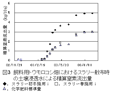 5) 飼料用トウモロコシでは、たい肥春施用の場合、現行同様たい肥中の窒素含量に0.2を、秋施用の場合0.12を乗じて窒素肥料に換算する。また、スラリーの春施用の場合、スラリー中の全窒素含量に0.4を乗ずる。ただし、全窒素含量のうちアンモニア態窒素含量が6割を超える場合はアンモニア態窒素含量に0.7を乗ずる。スラリー等液状ふん尿の前年秋施用は、地下への流亡と肥効低下を引き起こすので、行わない(図3)。