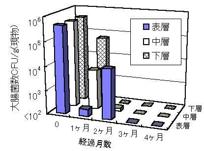 1)高水分固形状ふん尿やスラリー中の大腸菌は貯留期間中に減少し、バッチ処理(一括投入)では、温暖期では3~4ヶ月で検出されなくなり(図1,2)、寒冷期でも5~6ヶ月で顕著な減少を示した。スラリーの連続処理(連続投入)では、バッチ処理ほどの顕著な低減効果は見られなかったが、約6ヶ月間で2オーダー減少した(6ヶ月後:約104 CFU/g)。高水分固形状ふん尿からは最大で堆積重量の20%の排汁が発生し、堆積当初は高密度(105 CFU/ml)の大腸菌が検出された。