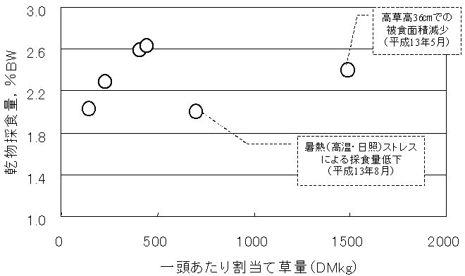 (3) 割り当て草量と乾物採食量の関係は草高25㎝以下の条件で成り立つ。