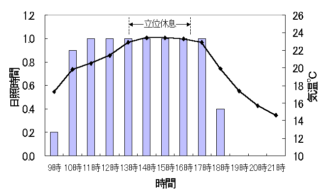 図3 平成13年8月の行動観察時における日照時間および気温の推移(棒グラフ;日照時間、折れ線;気温)