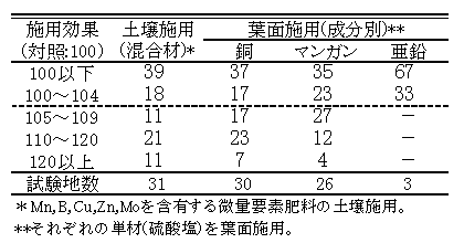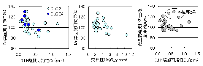 2) 銅の葉面施用によって明らかな増収(指数110%以上)が認められた地点は30%、マンガンの葉面施用効果が明らかな地点(指数110%以上)は16%に達した(表1)。微量要素肥料の土壌施用効果は主に土壌中の可溶性銅濃度に律せられた(図1)。