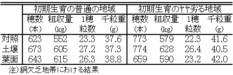 5) 秋まき小麦に対する銅とマンガンの葉面施用は幼形期から節間伸長初期にかけて、銅は20g/100L/10a/回、マンガンは100g/100L/10a/回を2回施用する。なお、初期生育の劣る地域では微量要素肥料の播種期土壌施用効果が銅の葉面施用効果よりまさった(表2)。