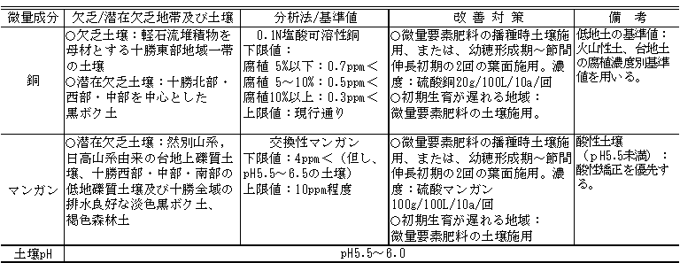 4) 銅の施用効果が発現する土壌の可溶性銅濃度は、①腐植濃度5%以下の土壌:0.7ppm未満、②同5〜10%の土壌:0.5ppm未満、③腐植濃度10%以上の土壌:0.3ppm未満であった。マンガンの施用効果が発現する地帯は然別山麓、日高山麓の礫質土壌に集中し、交換性マンガン濃度が4ppm未満で、土壌pH5.5〜6.5の範囲の土壌であった。