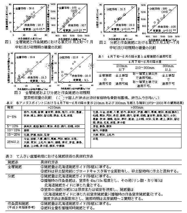 ⑨以上のように、2つの低ストレス型施肥技術(全層施肥、分肥)は直播てんさいにおいて初期生育の向上と増収が期待できることを明らかにし、さらに両施肥法を降水条件等の違いに応じて選択できる判断基準(表1、表2)を示した。