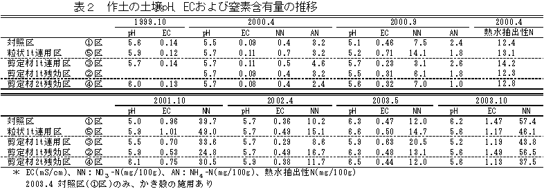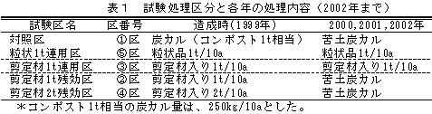 表1に設置した試験区と処理内容を示した。表の内容による試験処理は2002年まで行い、2003年はコンポスト資材の施用をやめ、全区炭カルの施用とした。