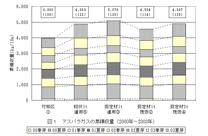 1) 収穫の各年とも、粒状および剪定材入りコンポスト各区の収量が、対照区を大きく上回った。2) 収穫4か年の累積収量では、剪定材1t連用区(約5t)>剪定材2t残効区、粒状1t連用区(約4.8t)>剪定材1t残効区(約4.5t)>対照区(約4t)の順であった(図1)。3) コンポスト施用区の中では、残効区に比べ連用区で多収であり、剪定材入り1t連用が、粒状1t連用を上回った。剪定材入りコンポスト残効では、1t施用より2t施用で収量への効果も高かった。4) 粒状および剪定材入りコンポスト施用による貯蔵根Brix値への影響は判然とせず、またコンポスト施用各区の増収効果との関係も不明であった。また、作物体各部の成分含有率および若茎のビタミンC濃度、Brix値などには、コンポスト施用による明瞭な影響は認められなかった。5) 粒状および剪定材入りコンポスト施用各区では、炭カル施用の対照区に比べ、土壌pHの上昇および交換性カルシウム濃度の高まる傾向が認められた(表2)。6) コンポストの連用区では、土壌中の全亜鉛および全銅(過塩素酸分解)の濃度は対照区に比較し増加した。7) 今試験における粒状および剪定材入りコンポスト各区の施用効果の要因の一つとしては、コンポスト施用によるカルシウム供給効果が大きいと推定された。また、造成時施用・深耕による、下層へコンポスト施用により、窒素およびリン酸等の養分供給効果があり、永年作物であるアスパラガス栽培での、後年への効果が期待できた。