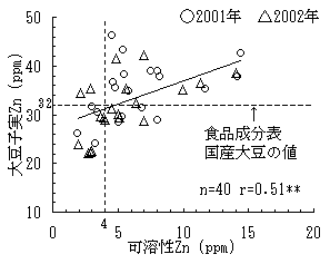 図1 作土の0.1N塩酸可溶性亜鉛と大豆子実亜鉛の関係