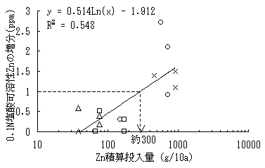図3 亜鉛の積算投入量と土壌可溶性亜鉛含有率の増分の関係