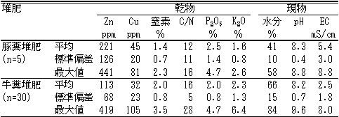 1)豚糞堆肥の施用にあたっては亜鉛・銅の品質基準を満たすものを選択するとともに、定期的に土壌診断を実施して、土壌診断基準を遵守する。