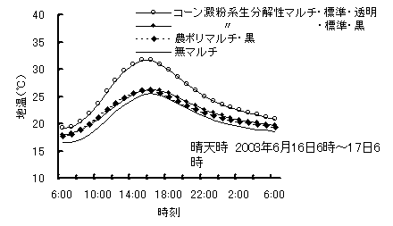 地温、土壌水分、雑草発生調査および土壌分解性調査、マルチすき込みの影響調査供試マルチ:標準(3ヶ月)タイプの透明、黒、白および分解加速タイプ