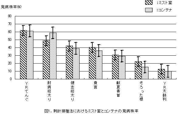 6)PPコンテナを用いた胚軸部への刺針接種後の霧吹き・密閉検定では,ミスト室を用いた検定と同様の傾向を示し,検定法として有効である。ただし,高湿度条件の維持(密閉状態)は1日間が適している。