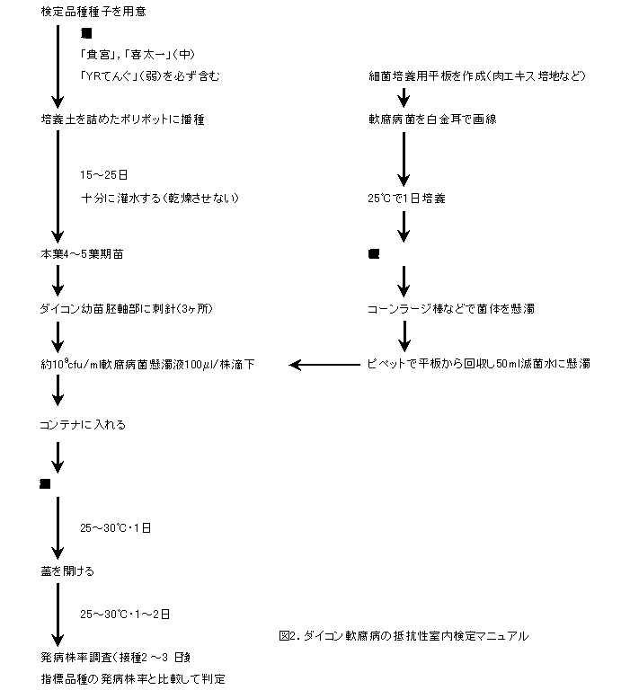 1)ダイコン軟腐病の品種間差が認められる接種法としては,胚軸部に刺針接種し,その後飽和湿度状態2日間がもっとも適している。