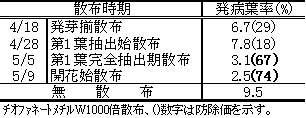 4)灰星病の重点防除時期は開花直前と満開3日後(花腐れ防除)、着色始(収穫20日前)〜収穫直前(果実腐れ防除)であり、幼果期間防除の省略が可能であった(表4)。ただし幼果期間が多湿に経過する場合はこの間も防除を徹底する。