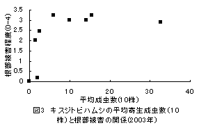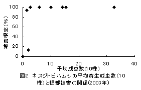 2)播種後30日前後の10株の葉寄生成虫数1-2頭以上(図2,3)(葉の被害程度計5以上:食害程度(0-5))で、収穫時の被害根率がほぼ100%、根部被害程度(0-4)は2(中)以上となった。