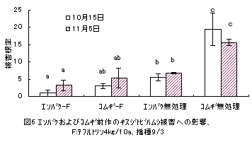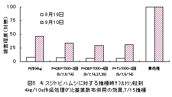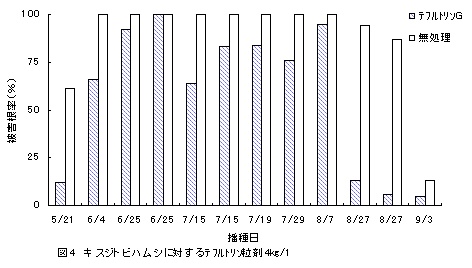 3)播種時処理の9薬剤のうち、テフルトリン粒剤4kg/10a作条施用(F剤)の被害防止効果が最も高く、収穫時まで持続したが、他粒剤の効果は播種1ヶ月程度であった。ジノテフラン剤またはダイアジノン剤とF剤の混用では共力効果はみられなかった。しかし、F剤でも多発期には被害を防ぎきれないため(図4)、茎葉散布の併用が必要である。現有の茎葉散布剤には卓効はないが、播種20-30日後からの複数回散布により根部被害低減や品質向上の効果がみられた(図5;DEP乳剤、トルフェンピラド乳剤(To))。