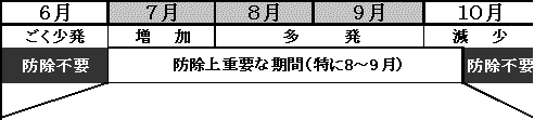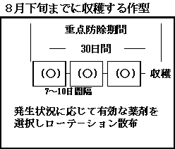 4)主要病害に対しては、収穫時期が8月までの作型では無農薬または収穫30日前を重点防除期間としたローテーション散布、9月以降の作型ではマンゼブ水和剤の予防散布を基本とした、8月中旬(べと病初発前)からのローテーション散布により減農薬栽培が可能である(図1)。