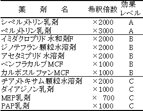 表1.ねぎのネギアザミウマに 対する登録薬剤の効果レベル