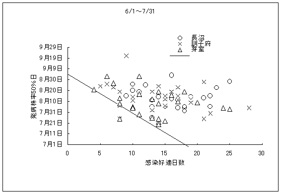 (3)感染好適日の出現頻度と発病株率50%到達日の関係を解析した。