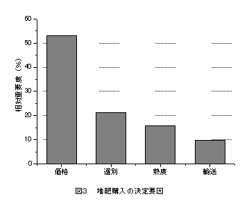 2)農家の堆肥購入を決定する要因は、価格が最も影響しており、ついで、選別の有無、熟度、輸送の有無の順であった(図3)。