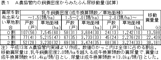 尿対策が必要となる乳牛飼養密度(乳牛成換頭数/草地面積)2.0頭/haを超える割合が農家戸数、草地面積とも3割以上となる(表1)。環境負荷を招かない適切な家畜ふん尿利用を推進するためには、草地の植生や土壌診断に基づく施肥の啓発・推進とともに、地域内で乳牛飼養密度が異なる経営間でのふん尿移動を含めた循環利用を継続的に推進するふん尿の地域的な利用システムの確立が急務である(B農協管内、C農協管内とも同様の傾向)。