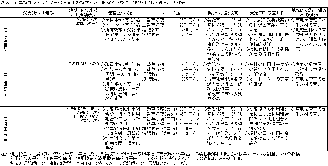 しかし、どの事例も余剰ふん尿対策が必要な農家が存在するが地域的な取り組みは行われていない。地域全体に環境負荷を考慮した草地管理と家畜ふん尿利用システムを広めるためには、農協コントラクターを中心とした取り組みに加え、草地を管理できる人材の育成やふん尿散布の委託量の取りまとめ、調整を行うしくみと支援組織の役割が重要である(表3)。