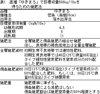 3)この目標収量を得るには、溶出の早いタイプの緩効性肥料(25℃20〜30日タイプを窒素成分の50〜100%配合)を用いた側条施肥と全層施肥の組み合せ法が適していたが、褐色低地土(施肥ガイドの良地帯に限定)では全量全層施肥が適していた(表1)。