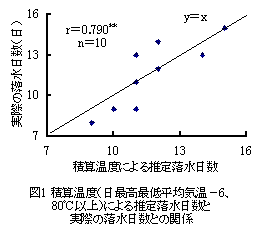 4)落水日数は、日最高最低平均気温から6℃以上の気温を播種翌日より積算して80℃に達する日により、±2日の誤差で推定できた(図1)。