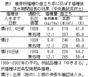 5)過酸化石灰被覆なしの催芽籾による栽培は、褐色低地土において初期生育の良好な地帯では播種量を10a当たり乾籾10kg、その他の地帯では同12kgとし、落水期間を3日長くすることで可能であった(表2、表3)。