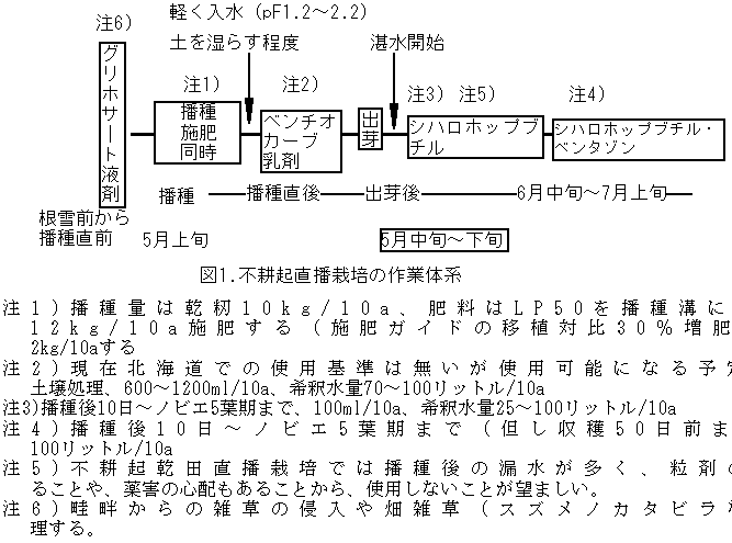 (1) 不耕起乾田直播栽培は、カルパー・耕起・代かきが不要で湛水直播よりも工程数が少ない省力低コスト技術である。本成績では上川中央部に適応した栽培体系を確立した(図1)。