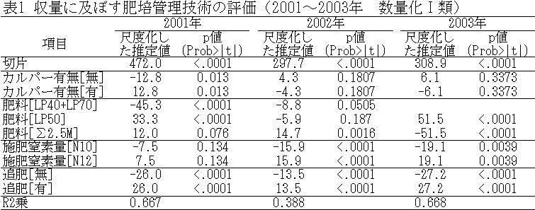 (4) 収量に及ぼすカルパー有無、肥料の種類、窒素施肥量、追肥有無の影響を年次別に数量化Ⅰ類で評価した。カルパーの効果は2001年のみ有意で、他の年次では有意ではなかった。肥料の種類別の収量は2002年を除きLP50が高かった。また、窒素施肥量では2001年を除き多肥で高く、追肥では全ての年次で追肥有が高かった(表1)。総合的に判断した結果、本技術の栽培方法として、カルパー無し、LP50、窒素施肥量12kg/10a(施肥標準の30%増肥)、幼穂形成期窒素追肥2kgが適当である。尚、リン酸とカリについては、圃場表面に窒素と同量施肥する。