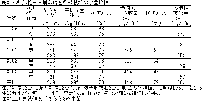 (5) 不耕起乾田直播栽培の平均収量は移植対比平均70%であった。数量化Ⅰ類で最適化した試験区では84%(2001年)、54%(2002年)、93%(2003年)で平均77%(428kg/10a)であった(表3)。