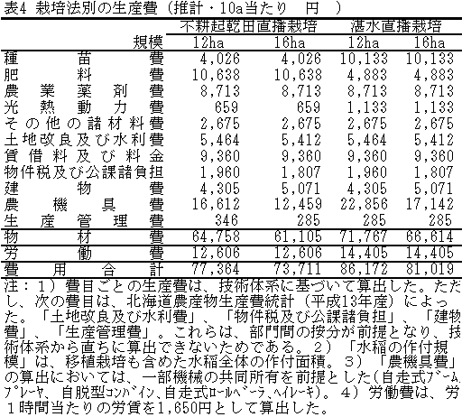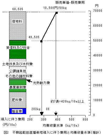 (6) 生産費を基に(表4)、水稲移植栽培経営(10ha以上)が不耕起乾田直播栽培を導入して規模拡大を図る場合、所得拡大が期待される収量水準は7俵=420kg以上と試算された(図2)。したがって、不耕起乾田直播栽培は水稲作付け規模14ha以上の大規模経営がさらに規模拡大をはかる場合、及び、省力性を活かし野菜作等との複合経営で活用される。