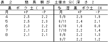 1)簡易耕が土壌の物理性に及ぼす影響は土壌タイプにより異なり、黒ボク土では土壌硬度が高まる傾向を示したが、多湿黒ボク土ではそれほど高まらなかった(図1)。両土壌とも簡易耕により容積重、固相率の上昇、気相率および透水係数の低下が認められ、(表1)、土壌水分は全般に高まり(pF値の低下)、多湿黒ボク土ではpF1.5以下となることが多かった(表2)。
