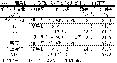 4)以上のように簡易耕導入の影響は土壌や気象条件、作物によって異なるが、規模拡大が進む中ではプラウ耕を必須とするのは困難であり、簡易耕は省力化、輪作体系確保や適期播種、さらに耕盤層の形成回避のために有効である。