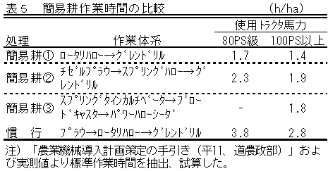 3)秋まき小麦播種前にプラウ耕を省略する場合、ばれいしょ跡はロータリハローやスプリングタインカルチベータ2回がけ、チゼルプラウなどにより残渣処理ができた(表4)。しかし、菜豆は残渣量が多く、ピックアップスレッシャ収穫後の簡易耕は困難で、カッティングスプレッダを装着したコンバインで収穫し、ディスクハロー2回またはチゼルプラウ2回処理することで残渣処理ができた。80PS級トラクタおよびグレンドリルを使用する簡易耕作業体系では、作業時間が1.7h/haであり、慣行のプラウ耕作業体系に比べ、2.1時間短縮できた。100PS以上のトラクタ体系でグレンドリルを用いた簡易耕作業体系は慣行に比べ1.4時間、パワーハローシーダでは1時間短縮できた(表5)。