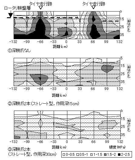 1)総合施肥播種機に5本の深耕爪が装着できるフレームおよび金具を取り付けた。爪形状はストレート型,ウェーブ型の2種類,作用深はそれぞれ110〜350mm,110〜230mmである。