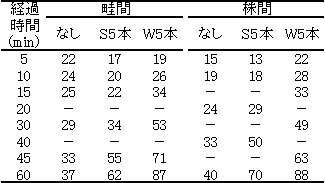 5)深耕爪によりトラクタ走行跡の畦間および株間の表面水の浸透量は,畦間で25〜50mm/h,株間で30〜48mm/h増加した(表2)。浸透量はウェーブ型深耕爪が優っていた。