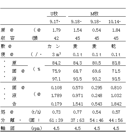 4)固液分離機の1時間あたりの処理能力はが0.54〜0.73t/hであることから、成牛頭数換算で10〜16頭規模となり、曝気装置は1日に5m3の液分移送が行なわれることから、成牛頭数換算で170〜190頭分の分離液分を処理することが可能である。施設全体の処理可能頭数は固液分離機の稼動時間によって決定され、固液分離機を4時間稼動とした場合は、成牛頭数換算で40〜55頭規模となる。