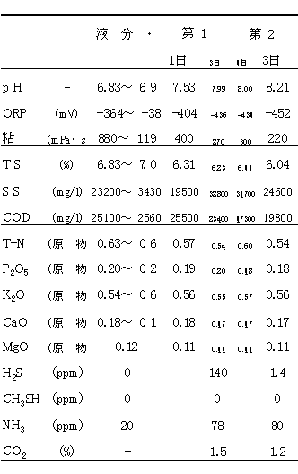 3)1サイクル45分で1日17.5時間稼動・6日間処理の曝気処理により処理液のpHの上昇、粘度の低下、液温の上昇、第2槽の発生ガス濃度を第1槽と比べCO2で20%、H2Sでは99%の低下が認められたことから好気発酵が進んでいると判断された。肥料成分の減少率は全窒素で約15%、他は僅かであった。また、SSは第1槽で増加して第2槽で低下したが、TSが15%程度、CODも20%程度低下した。機械式消泡と送気量制御により急激な発泡を抑制する曝気処理が行なわれていた。