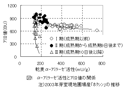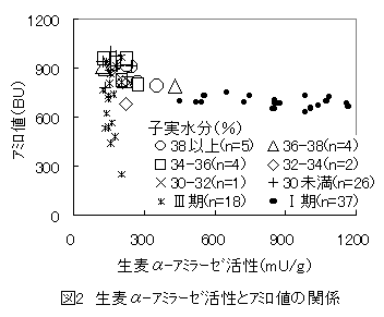 2)Ⅱ期のうち成熟期5日後以前あるいは子実水分が32%以上のもののα-アミラーゼ活性とアミロ値の関係は、Ⅰ期の両者の関係と同様であり、Ⅲ期の傾向とは明らかに異なっていた(図2)。