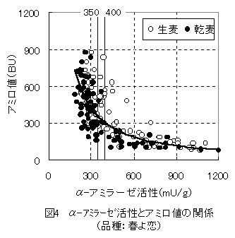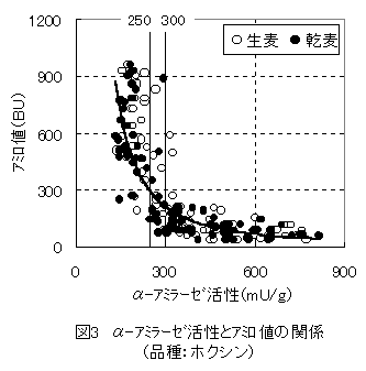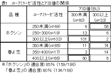 3)ホクシンの全調査点数186点のうちα-アミラーゼ活性が250mU/g未満でアミロ値が300BU以上のものは58点、活性が300mU/g以上でアミロ値が300BU未満のものは101点あり、両者の合計は全体の85%(159/186)であった。一方、春よ恋の全調査点数168点のうちα-アミラーゼ活性が350mU/g未満でアミロ値が300BU以上のものは74点、活性が400mU/g以上でアミロ値が300BU未満のものは60点あり、両者の合計は全体の80%(134/168)であった(図3・4、表1)。