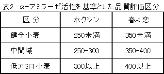 4)ドライケミストリー法によるシステムを用いて測定したα-アミラーゼ活性に基づき①健全小麦、②中間域、③低アミロ小麦の3区分の品質評価区分を設定した(表2)。