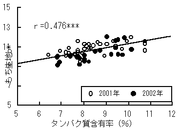 図3 タンパク質含有率ともち生地のb*(黄味)との関係 2001-2002年、「はくちょうもち」 上川農試・現地圃場 01年n=39、02年n=29