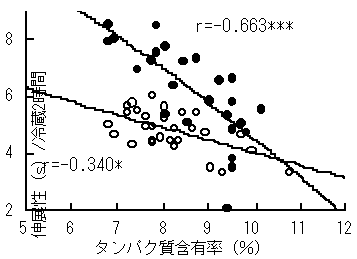 図4 タンパク質含有率ともち生地の「伸展性」の関係 材料および凡例は図3に同じ