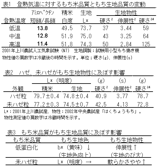 供試材料:2001-2002年産「はくちょうもち」(上川農試、風連・名寄現地圃場の栽培試験およびポット試験) 品質評価:もち米(白度、色、タンパク質含有率、アミロペクチン単位鎖長)