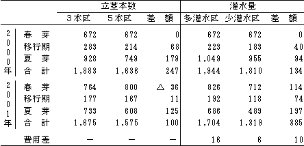 表1 立茎本数と灌水量の経済性 単位:千円/10a