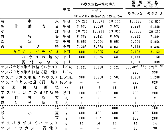 表2 アスパラガス立茎栽培導入による複合経営モデル