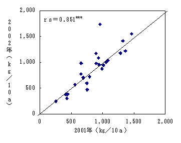 1)ハウス立茎栽培の収量(kg/10a)を年次間で比較したところ、経営ごとの収量の順位は、一致する傾向にあった(図1)。