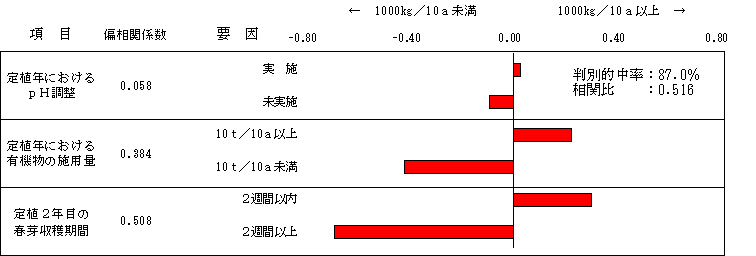 2)ハウス立茎栽培において収量の高い経営の特徴として、定植前に多量の有機物を施用し、土壌診断に基づくpH調整等の土壌改良に努めていることに加えて、定植2年目には春芽の収穫期間を短縮させ、株の養成に努めていることが確認された(図2)。